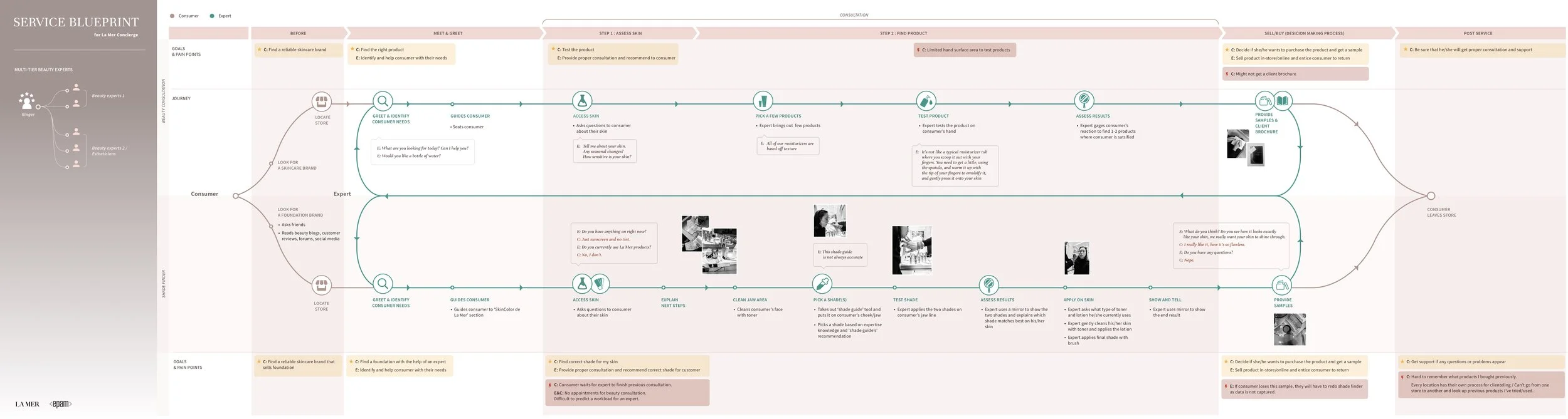 I synthesized my research and outlined a draft service blueprint, directing another offshore UX designer for creating the service map. After mapping experiences for client consultation and shade finder, and guerrilla research, we were able to extract insights to formulate a design strategy.